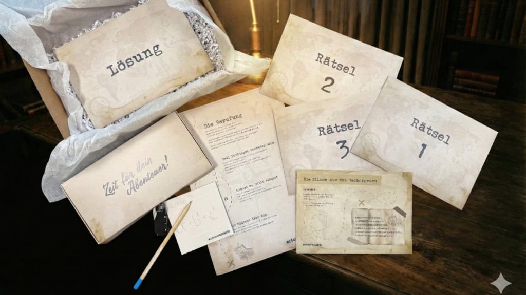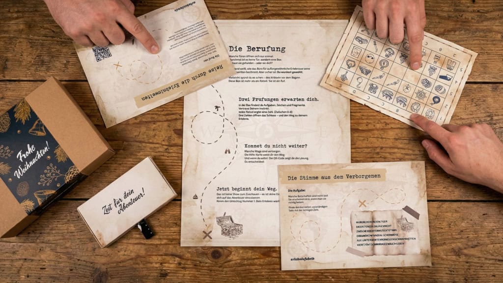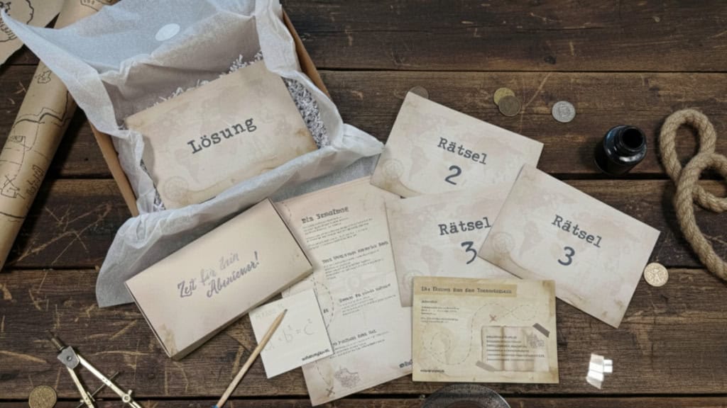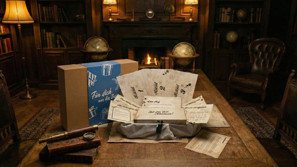 Für nur 9,90 € bekommst Du eine hochwertige Geschenkbox, drei interaktive Rätsel, ein digitales Mini-Spiel, Hinweiskarten, Lösung, Zahlenschloss sowie liebevoll gestaltete Materialien, die den Gutschein zu einer echten Überraschung machen.