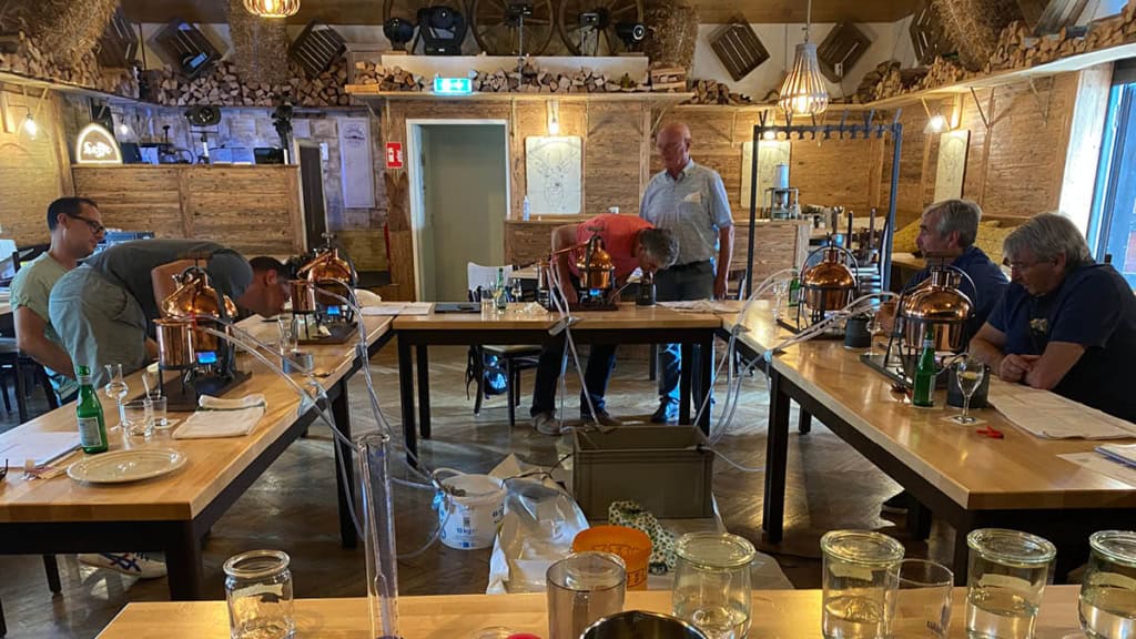 Das Seminar beginnt mit einer herzlichen Begrüßung, bei der die Teilnehmer sich und den Kursleiter kennenlernen. Dann folgt eine Einführung in die Grundlagen der Brennkunst. Welche Rohstoffe sich eignen, welche Geräte verwendet werden und wie der Brennvorgang abläuft. Jeder Teilnehmer des Distallationsseminars erhält eine Aufzeichnung, das die wichtigsten Schritte erklärt und beim späterem Nachlesen hilft. Unter Anleitung wird das Brenngerät bedient und die eigene Mischung für den Schnaps vorbereitet. Am Ende darf jeder Teilnehmende drei Flaschen à 100 ml des eigenen Destillats mit nach Hause nehmen.